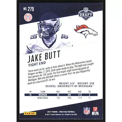 This is a 2017 Prestige Jake Butt football card. The card is #279 and pictures show condition.