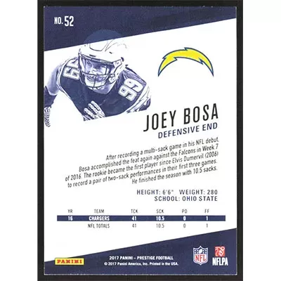 This is a 2017 Prestige Joey Bosa football card. The card is #52 and pictures show condition.