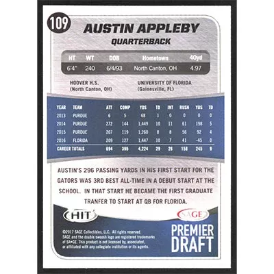 This is a 2017 SAGE HIT Premier Draft Austin Appleby football card. The card is #109 and pictures show condition. Team: Florida Gators Rookie Card