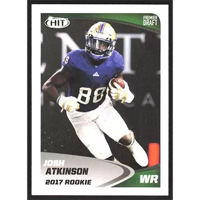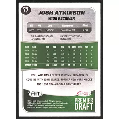 This is a 2017 SAGE HIT Premier Draft Josh Atkinson football card. The card is #77 and pictures show condition. Team: Tulsa Golden Hurricane Rookie Card