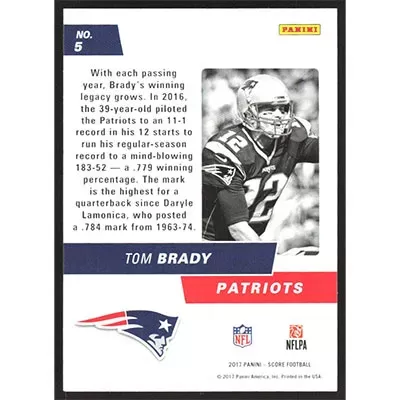 This is a 2017 Score Signal Callers Tom Brady football card. The card is #5 and pictures show condition.