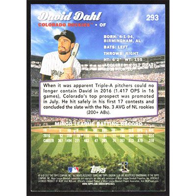 This is a 2017 Stadium Club David Dahl baseball card. The card is #293 and pictures show condition.