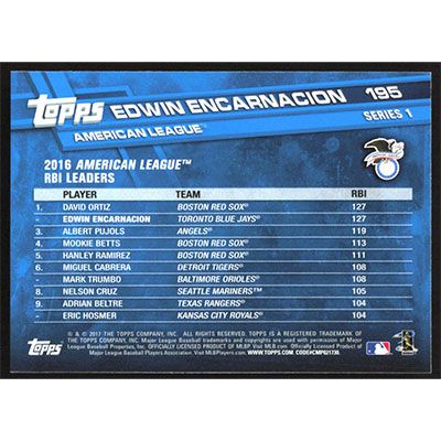 This is a 2017 Topps Edwin Encarnacion League Leaders baseball card. The card is #195 and pictures show condition.