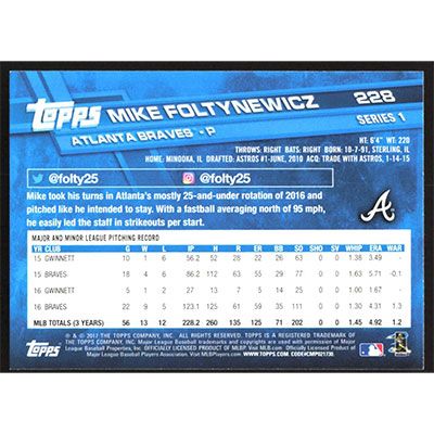This is a 2017 Topps Mike Foltynewicz baseball card. The card is #228 and pictures show condition.