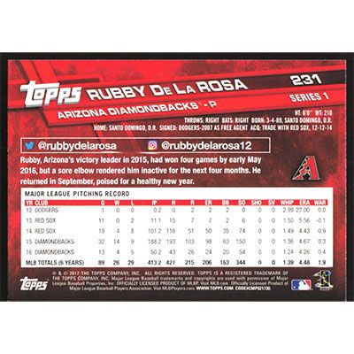 This is a 2017 Topps Rubby De La Rosa baseball card. The card is #231 and pictures show condition.