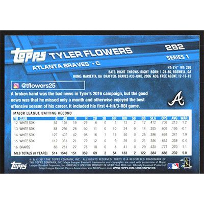 This is a 2017 Topps Tyler Flowers baseball card. The card is #282 and pictures show condition.