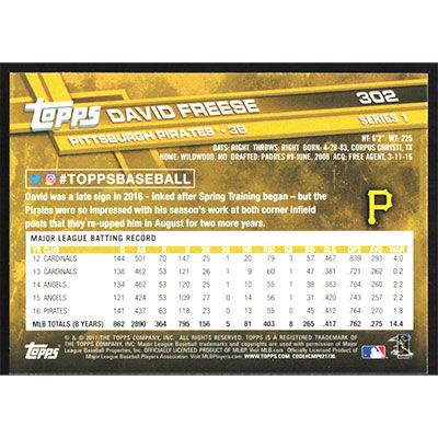 This is a 2017 Topps David Freese baseball card. The card is #302 and pictures show condition.