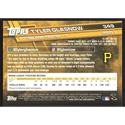 This is a 2017 Topps Tyler Glasnow SP - Black Jersey baseball card. The card is #349 and pictures show condition. Team(s): Pittsburgh Pirates Rookie Card (RC)