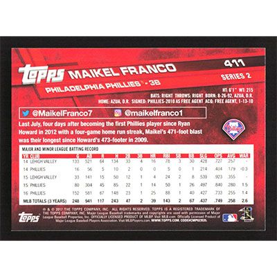 This is a 2017 Topps Maikel Franco baseball card. The card is #411 and pictures show condition.