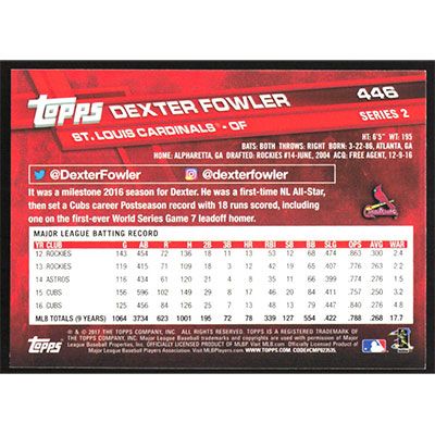 This is a 2017 Topps Dexter Fowler baseball card. The card is #446 and pictures show condition.