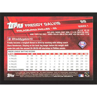 This is a 2017 Topps Freddy Galvis baseball card. The card is #88 and pictures show condition.