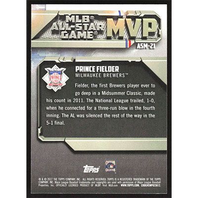 This is a 2017 Topps All-Star Game MVPs Prince Fielder baseball card. The card is #ASM-21 and pictures show condition.