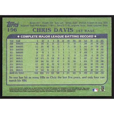 This is a 2017 Topps Archives Chris Davis baseball card. The card is #196 and pictures show condition.
