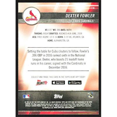This is a 2017 Topps Bunt Blue Dexter Fowler baseball card. The card is #118 and pictures show condition.