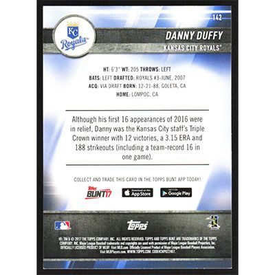 This is a 2017 Topps Bunt Blue Danny Duffy baseball card. The card is #142 and pictures show condition.