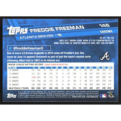 This is a 2017 Topps Chrome Freddie Freeman baseball card. The card is #146 and pictures show condition.