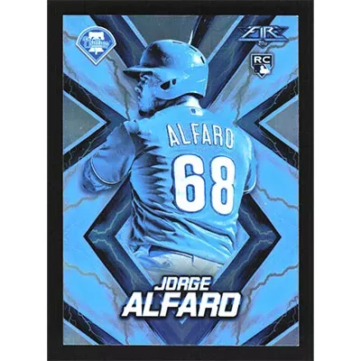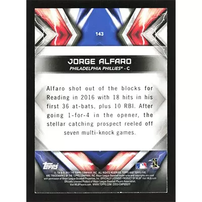 This is a 2017 Topps Fire Blue Chip Jorge Alfaro baseball card. The card is #143 and pictures show condition. Team(s): Philadelphia Phillies Rookie Card (RC)
