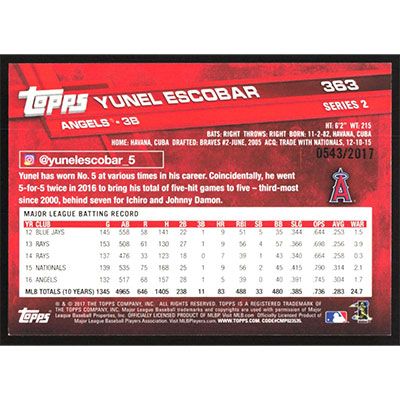 This is a 2017 Topps Gold Yunel Escobar baseball card. The card is #363 and pictures show condition. This card is limited; #'d 0543/2017. Team(s): Los Angeles Angels