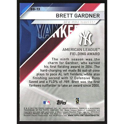 This is a 2017 Topps Golden Glove Awards Brett Gardner baseball card. The card is #GG-13 and pictures show condition.
