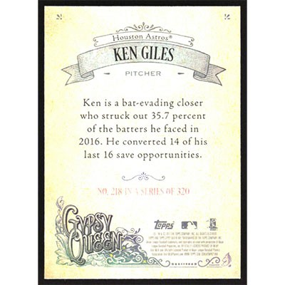 This is a 2017 Topps Gypsy Queen Ken Giles baseball card. The card is #218 and pictures show condition.