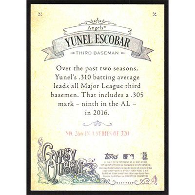 This is a 2017 Topps Gypsy Queen Yunel Escobar baseball card. The card is #266 and pictures show condition.
