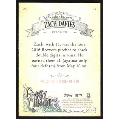 This is a 2017 Topps Gypsy Queen Zach Davies baseball card. The card is #267 and pictures show condition.