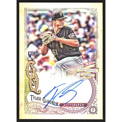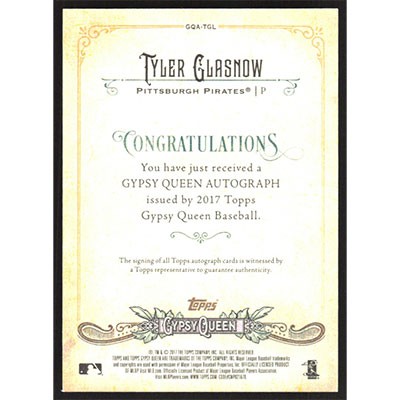 This is a 2017 Topps Gypsy Queen Autographs Tyler Glasnow autographed baseball card. This card has been signed, in blue, by Tyler Glasnow, and is certified authentic by Topps. The card is #GQA-TGL and pictures show condition.