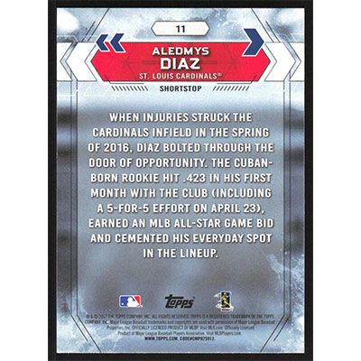 This is a 2017 Topps National Baseball Card Day Aledmys Diaz baseball card. The card is #11 and pictures show condition.