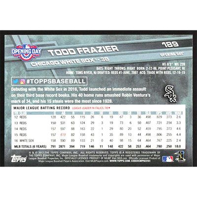 This is a 2017 Topps Opening Day Todd Frazier baseball card. The card is #189 and pictures show condition.