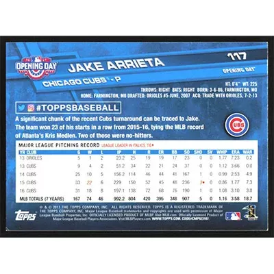 This is a 2017 Topps Opening Day Blue Foil Jake Arrieta baseball card. The card is #117 and pictures show condition.