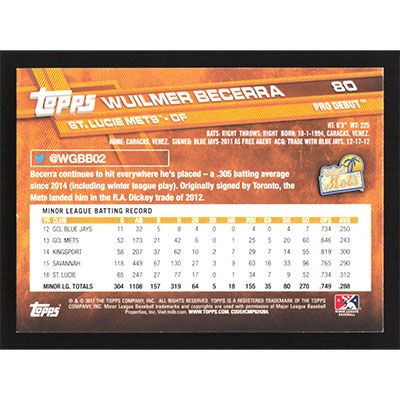 This is a 2017 Topps Pro Debut Wuilmer Becerra baseball card. The card is #80 and pictures show condition.