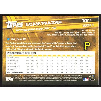 This is a 2017 Topps Rainbow Foil Adam Frazier baseball card. The card is #383 and pictures show condition.