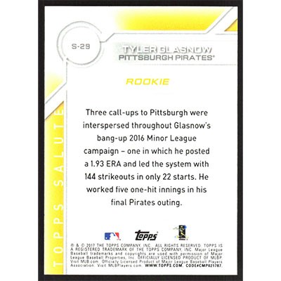 This is a 2017 Topps Salute Tyler Glasnow baseball card. The card is #S-29 and pictures show condition. Team(s): Pittsburgh Pirates Rookie Card (RC)
