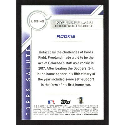 This is a 2017 Topps Update Salute Kyle Freeland baseball card. The card is #USS-49 and pictures show condition. Team(s): Colorado Rockies Rookie Card (RC)