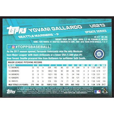 This is a 2017 Topps Update Yovani Gallardo baseball card. The card is #US213 and pictures show condition.