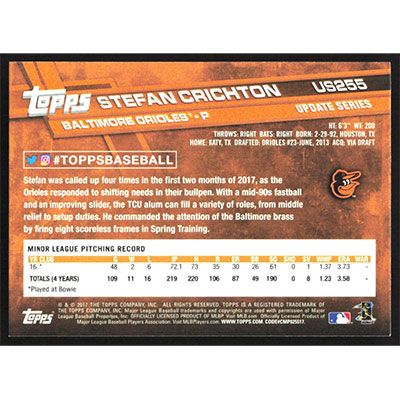 This is a 2017 Topps Update Stefan Crichton baseball card. The card is #US255 and pictures show condition. Team(s): Baltimore Orioles Rookie Card (RC)
