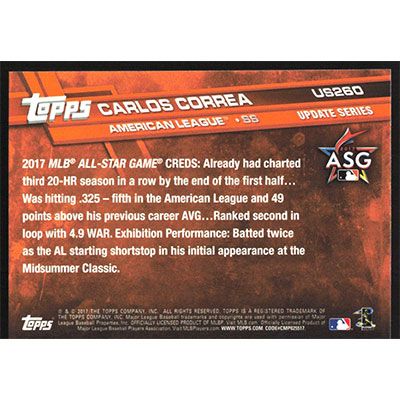 This is a 2017 Topps Update Carlos Correa All-Star baseball card. The card is #US260 and pictures show condition.