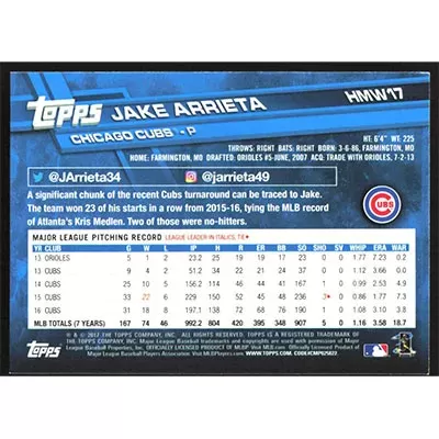 This is a 2017 Topps Wal-Mart Holiday Snowflake Jake Arrieta baseball card. The card is #HMW17 and pictures show condition.