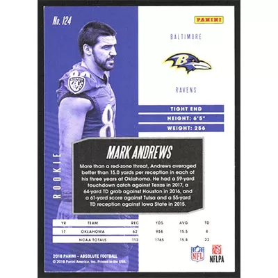 This is a 2018 Absolute Mark Andrews football card. The card is #124 and pictures show condition.