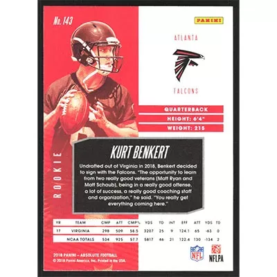 This is a 2018 Absolute Spectrum Gold Kurt Benkert football card. The card is #143 and pictures show condition.