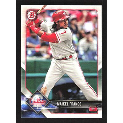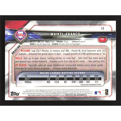 This is a 2018 Bowman Maikel Franco baseball card. The card is #13 and pictures show condition.
