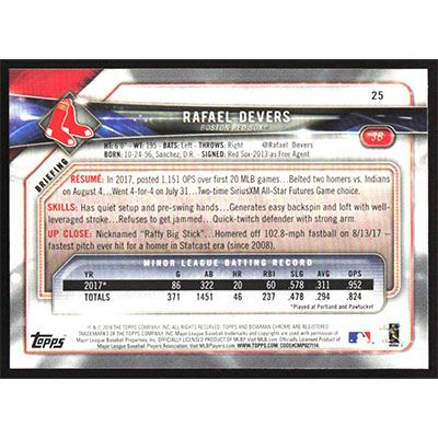 This is a 2018 Bowman Rafael Devers baseball card. The card is #25 and pictures show condition.