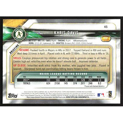 This is a 2018 Bowman Khris Davis baseball card. The card is #45 and pictures show condition.