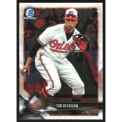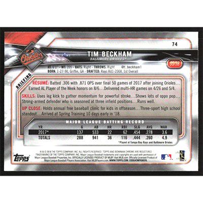 This is a 2018 Bowman Chrome Tim Beckham baseball card. The card is #74 and pictures show condition.