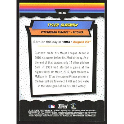 This is a 2018 Bowman Chrome Birthdays Refractors Tyler Glasnow baseball card. The card is #BB-TG and pictures show condition. Team(s): Pittsburgh Pirates