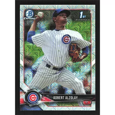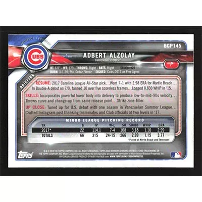 This is a 2018 Bowman Chrome Mega Box Prospects Refractors Adbert Alzolay baseball card. The card is #BCP145 and pictures show condition. Team(s): Chicago Cubs