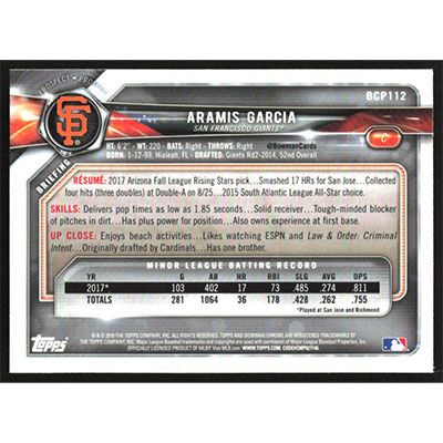 This is a 2018 Bowman Chrome Prospects Aramis Garcia baseball card. The card is #BCP112 and pictures show condition.