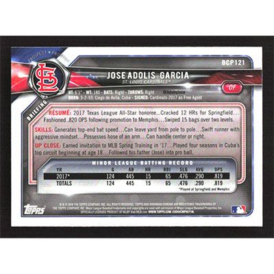 This is a 2018 Bowman Chrome Prospects Jose Adolis Garcia baseball card. The card is #BCP121 and pictures show condition.