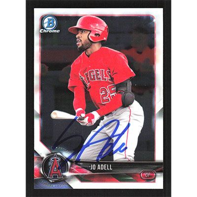 This is a 2018 Bowman Chrome Prospects Jo Adell autographed baseball card. This card has been signed, in blue, by Jo Adell, and is guaranteed authentic by Ballcardz.com. The card is #BCP136 and pictures show condition.