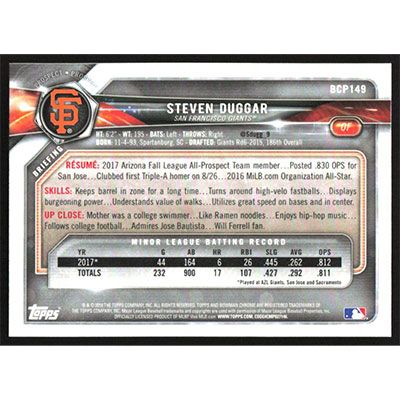 This is a 2018 Bowman Chrome Prospects Steven Duggar baseball card. The card is #BCP149 and pictures show condition.